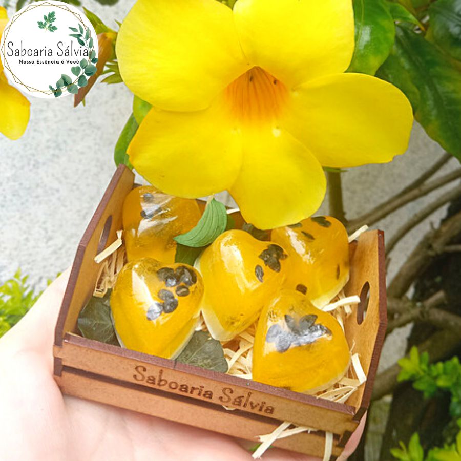 5 Unidades de sabonetes: 125 gramas. Composição: Base Glicerinada, essência maracujá, extrato de amêndoas, pigmentos.