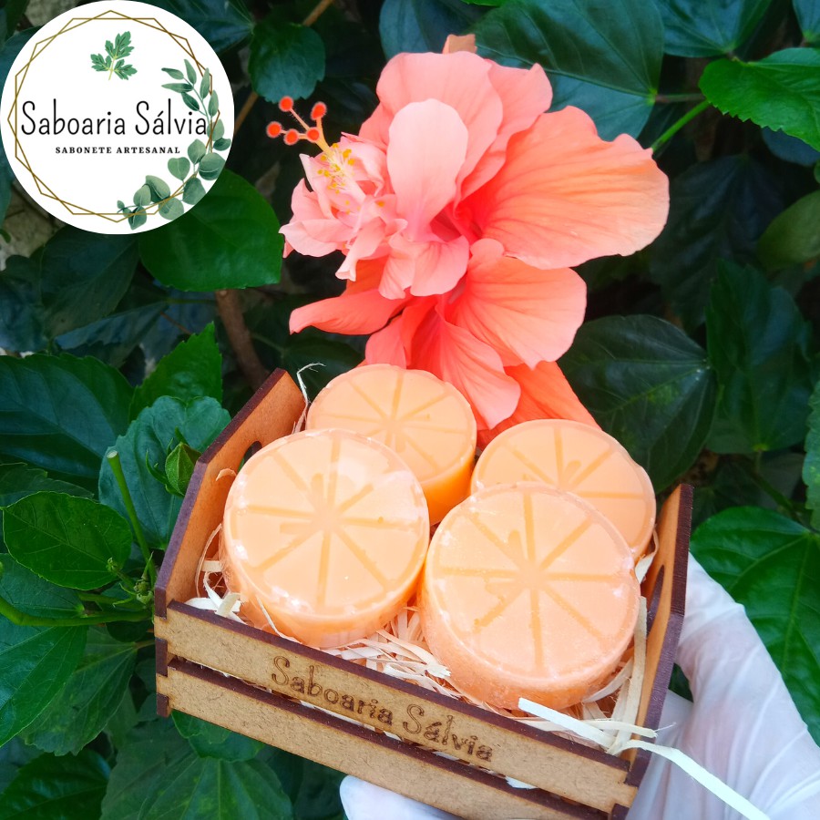 4 Unidades de Tangerina/Bergamota, acompanha caixotinho de madeira de reflorestamento ecológico. Extrato selecionado de Amêndoas, glicerinado PH Neutro - Aroma refrescante e frutal, presenteie quem você ama com nossos produtos exclusivos.