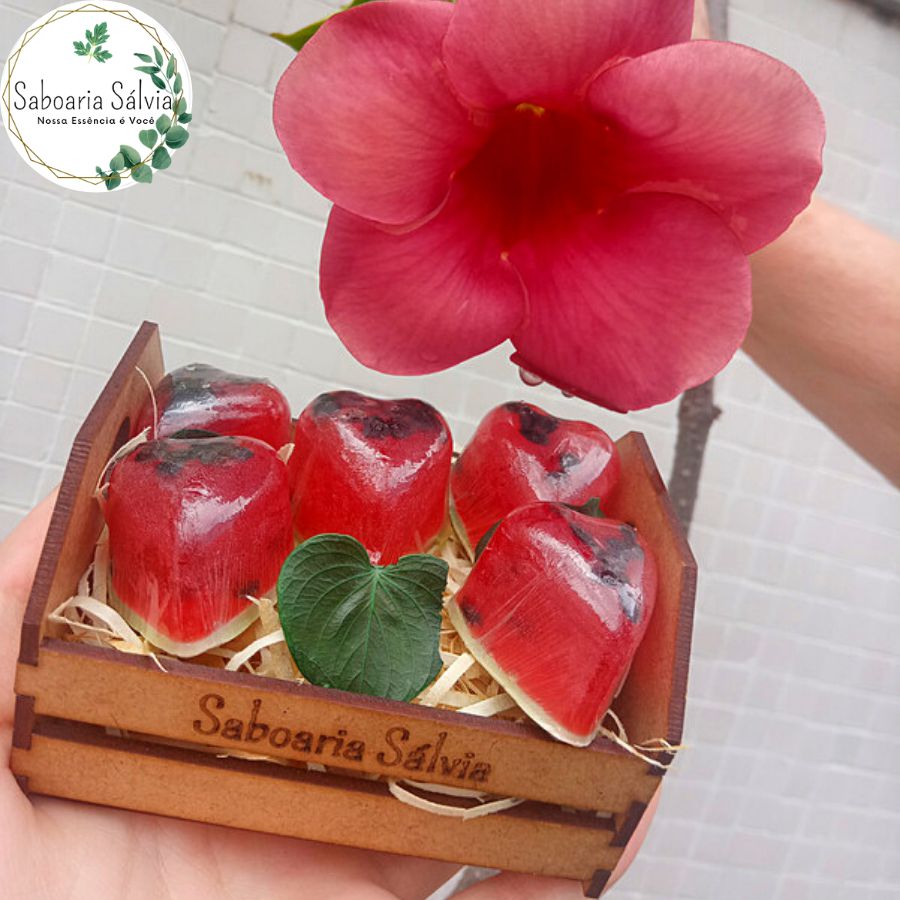 Composição: Base Glicerinada, essência melancia, extrato de amêndoas, pigmentos. Acompanha caixotinho de reflorestamento de madeira ecológica e sustentável com palha e folhas secas.